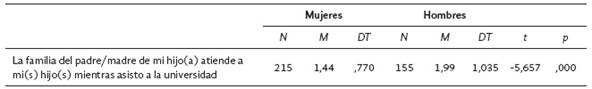 En esta parte se encontró solamente una diferencia significativa entre los padres y las madres estudiantes. Los hombres tienen más apoyo por parte de la familia de la madre de su hijo para que ellos puedan asistir a clases, en comparación con las mujeres.