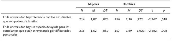 En este apartado se encontraron dos diferencias significativas entre padres y madres estudiantes. Las mujeres perciben menos tolerancia y menos espacios de ayuda en la universidad, en comparación con los varones.