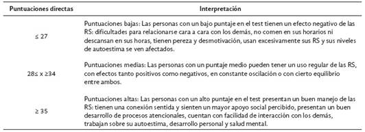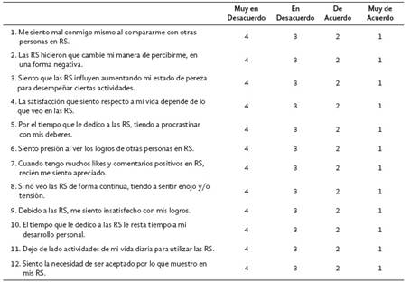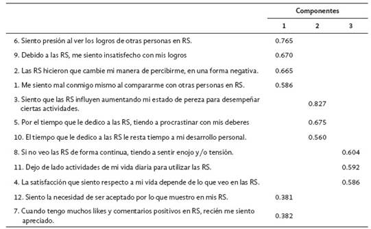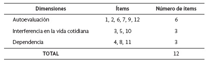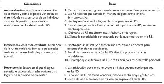 En un inicio, se redactó la escala con 42 ítems y se procedió a aplicarla a los 205 participantes del estudio. Con los resultados obtenidos, se realizó un análisis de los ítems para eliminar aquellos que no discriminan correctamente, de esta forma fueron excluidos 12. Luego se realizó un análisis factorial exploratorio con los 30 ítems restantes y fueron excluidos aquellos que no correspondían significativamente a ninguna dimensión, y se quitaron 18. Finalmente, el Test de Efectos de las Redes Sociales (TERS) quedó compuesta por 12 ítems distribuidos en tres dimensiones: Autoevaluación, Interferencia en la vida cotidiana y Dependencia (Tabla 1). Asimismo, en la Tabla 2 se encuentra detallada una explicación sobre cada una de las dimensiones mencionadas y los ítems que las componen.