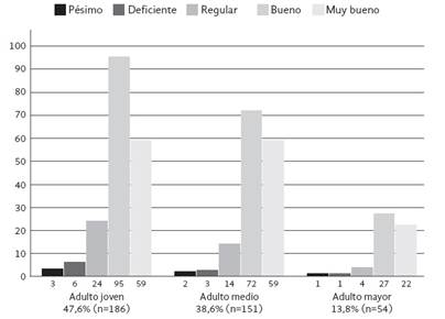 En la siguiente figura se puede observar que son principalmente los adultos jóvenes (n=95), seguido de los adultos medios (n=72) y los adultos mayores (n=27) quienes valoran positivamente la fluidez verbal, la postura y los gestos, entre otros indicadores de la comunicación asertiva, siendo los adultos jóvenes y adultos medios en igualdad (n=59) quienes los señalan como Muy buenos, y en menor cantidad los adultos mayores (n=22).