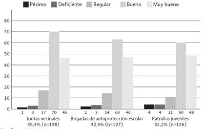 En la figura 2 , se representa la comunicación asertiva segmentada por los grupos que forman parte de la Policía Comunitaria y se observa la tendencia mayoritaria en las calificaciones de Bueno y Muy bueno, tanto en las JV, como en las BAPE y las PJ.