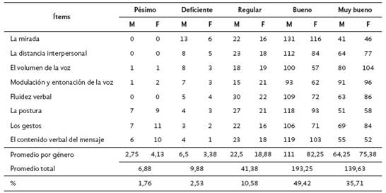 Es común oír que, mirar a los ojos es signo de sinceridad. Lo mismo ocurre en esta investigación cuando se interroga sobre si, al comunicar ideas entre pares, se mira al interlocutor. En su gran mayoría, los encuestados consideraron que su mirada es buena (46,3%, n=181) y muy buena (37,9%, n=148) cuando se comunica con su interlocutor. Se corrobora entonces la asertividad no verbal que identifica Miranda (2023).