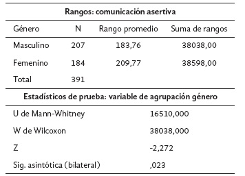 Para el análisis inferencial, se utilizó el programa SPSS y a través de la prueba de normalidad Kolmogorov-Smirnov se evidenció que la variable comunicación asertiva no sigue una distribución normal (valor p = 0,000 < 0,05 =α, se rechaza H0), por lo que se decide utilizar la prueba no paramétrica U de Mann-Whitney para determinar la diferencia de dos medias para el caso de la agrupación género. Así se observa: