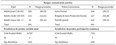 Asimismo, para el caso de las diferencias de medias para los 3 grupos etarios y los 3 gru- pos que participan de la Policía Comunitaria, al no evidenciarse normalidad en la variable Comunicación Asertiva, se decide utilizar la prueba no paramétrica Kruskal-Wallis: