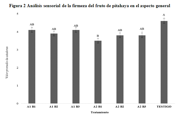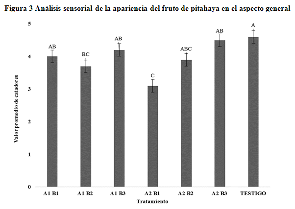 La apariencia en el aspecto general de la fruta (figura 3), evidencia que el testigo es el de mayor valor, fue el mejor aceptado por los catadores, el cuál presenta diferencia con el tratamiento A2B1, que es poco aceptable, mientras que el resto de tratamientos muestran similitud.