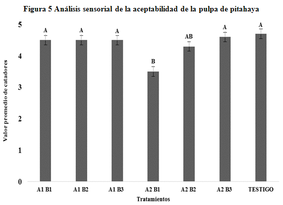 Evaluación Sensorial: Sobre el aspecto general del color de la fruta (figura 1), los tratamiento A1B3 (almacenamiento al ambiente con madures del 75-90%) y A2B3 (almacenamiento al frío con madures del 75-90%) tienen los mayores valores promedio en la escala hedónica, se interpreta como color muy aceptable por los catadores y difieren con el tratamiento A2B1 (almacenamiento al frío con madures del 15-25%), con un promedio de 2.7, catalogado como color neutral, por ser un valor intermedio de la escala. Esto se debe a que los frutos del tratamiento A2B1 al parecer retardan el proceso de maduración y por ende el avance del cambio en la coloración de la cáscara. En el estudio realizado por (Alvarado-Romero 2014) expone que el fruto cosechado, genera un ligero incremento del color hasta tres días después de la cosecha, de aquí en adelante inicia la degradación de la calidad del color.