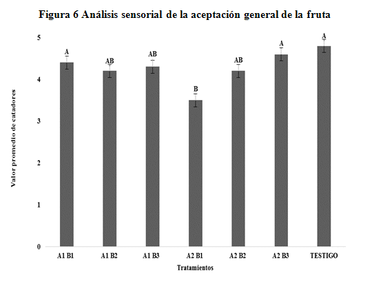 En la figura 6 se aprecia variaciones en cuanto a la aceptación general de la fruta, destacándose el testigo y el tratamiento A2B3 y el A1B.