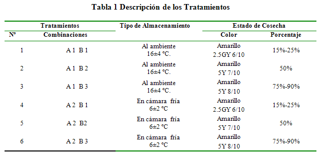 Para evaluar las características sensoriales de la fruta, se aplicó el diseño de bloques completos al azar (BCA) donde las condiciones de proceso fueron los seis tratamientos y los bloques fueron los diez catadores. En los tratamientos se incluyó una muestra testigo para efectuar comparaciones de preferencia frente a los seis tratamientos en estudio, esta muestra, estuvo representada por una fruta recién cosechada en óptimo estado fisiológico, utilizándose un total de 70 frutas para la determinación de los valores organolépticos, incluidos los 10 testigos (Tabla 1).