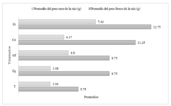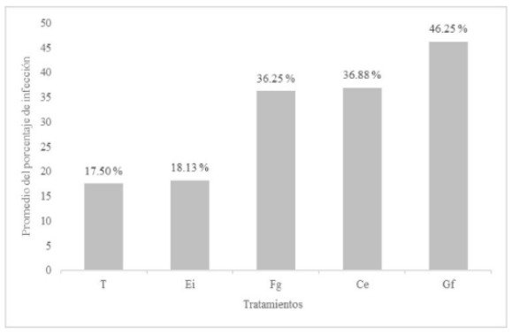 La codificación empleada para los tratamientos fue: T (Testigo), Fg (Funneliformis geosporum), Ce (C. etunicatum), Gf (G. fasciculatum), Ei (E. infrequens).