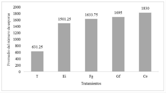 El número de esporas tiene diferencias importantes de acuerdo con el lugar que se tomen las muestras. Diversos autores han reportado variaciones en la cuantificación del número de esporas33-37. En la figura 4, se observa en el tratamiento inoculado con C. etunicatum (1830 esporas/10 g de suelo), estadísticamente similares a los tratamientos inoculados con G. fasciculatum y F. geosporum. Las diferencias en el número de esporas de HMA del suelo también pueden estar relacionadas con diferentes estrategias de supervivencia de las especies de HMA al habitar en un ecosistema determinado, es decir, el ciclo de vida de los HMA presenta una alta adaptación al ambiente que los rodea, sobre todo durante la etapa de formación de esporas, además su habilidad competitiva puede ser afectada por diversos factores38 en dependencia de la especie fúngica inoculada. De manera general se conoce que las variaciones en el número de esporas de HMA pueden estar asociadas a patrones estacionales de esporulación, que puede variar de acuerdo con la especie de HMA o de la planta hospedera39.