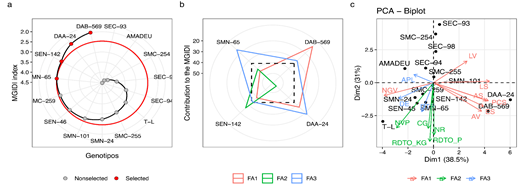 Los genotipos seleccionados se representan mediante puntos de color rojo en la Figura 1a, mientras que el círculo de color rojo representa el punto de corte determinado por la presión de selección (~25 %). Sin embargo, este último dato puede ser determinada según el criterio y propósito de cada investigador. Los puntos fuertes y débiles se observan como la proporción de cada factor en el índice MGIDI (Figura 1b). Esto implica que cuanto menor sea la proporción explicada por un factor (más cercano al borde externo), más cerca estarán los rasgos de ese factor del tratamiento "ideal". El círculo discontinuo de color negro en el centro muestra el valor teórico que se obtendría si todos los factores hubiesen contribuido de manera uniforme. Finalmente, la Figura 1c complementa esta metodología al visualizar la relación entre los genotipos, las variables de respuesta, la distribución de grupos y la contribución de cada característica fenotípica.