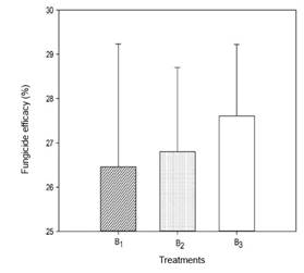 Fungicide efficacy. The control percentage of R. solani according to the treatments analyzed, (Figure 1), revealed that B3 achieved an efficacy of 27.60 %. B2 and B1 showed 26.80 and 26.46 %, respectively. These values did not differ significantly from each other. The coefficient of variation was 22.08 %. Among the evaluated varieties, none of the fungicide treatments exceeded 30 % efficacy for controlling R. solani.