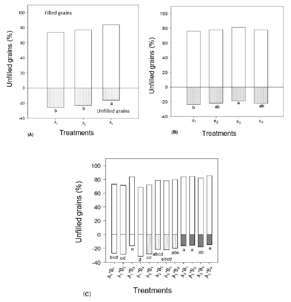 To determine the percentage of unfilled grains per panicle, five panicles were randomly selected from each EU, and the percentage of filled and unfilled grains was recorded.