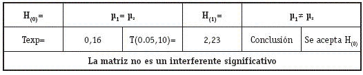 Se prepararon 6 muestras sin interferencias (soluciones de estándares de trabajo) y 6 muestras con interferencias (soluciones de estándares de trabajo con matriz) a la concentración media de la curva de calibración (500 ng/mL).