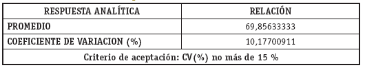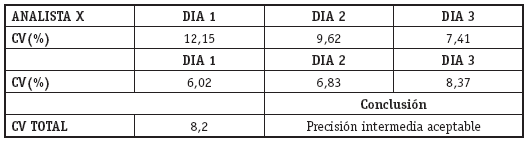 La precisión intermedia mide la variabilidad del método en este caso se optó por días diferentes y analistas diferentes, realizando el análisis a la concentración media de la curva en matriz fortificada de 500 ng/mL y se calculó el coeficiente de variación total (CV).