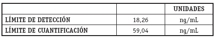 Para evaluar el límite de detección y cuantificación se prepararon tres concentraciones menores al punto más bajo de la curva de calibración, (50, 70 y 90 ng/mL) por triplicado y se determinó la curva de calibración para estas concentraciones.