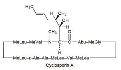 La ciclosporina es un fármaco inmunosupresor ampliamente usado en el trasplante de órganos entre dos personas con el objeto de reducir la actividad del sistema inmunitario del paciente y el riesgo de rechazo del órgano. Ha sido estudiada en el trasplante de piel, corazón, riñón, pulmón, páncreas, médula ósea e intestino. La ciclosporina es un péptido no ribosomal cíclico de 11 aminoácidos (undecapéptido) producido por el hongo Tolypocladium inflatum Gams, aislado inicialmente de una muestra de suelo noruego.