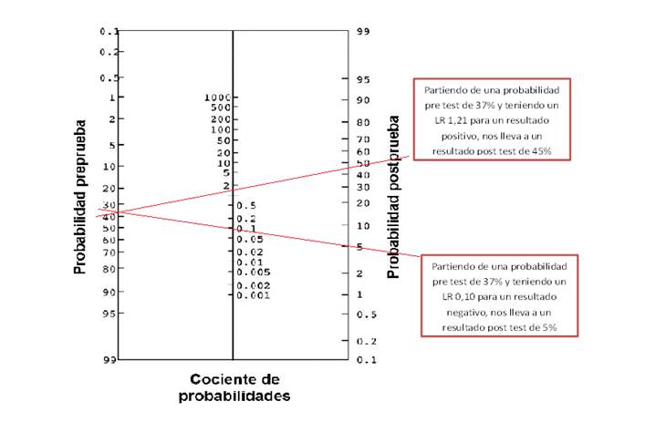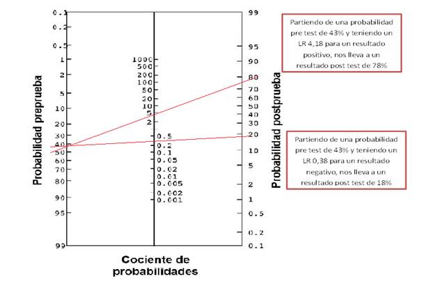 Para representar los likelihood ratios se utiliza el nomograma de Fagan, este permite traducir el LR de un test, en un cambio objetivo de la probabilidad pre test a post test; en otras palabras nos permite observar el aumento de la probabilidad de tener un resultado positivo y la disminución de la probabilidad de tener un resultado que no sea verdaderamente negativo. En las figura 1 y 2 se observa los resultados del cálculo del nomograma de Fagan para el diagnóstico de resistencia a Isoniacida y Rifampicina respectivamente. En la columna izquierda se observa la probabilidad pre test, en la columna central se observa el valor del LR y en la columna derecha se observa la probabilidad post test.