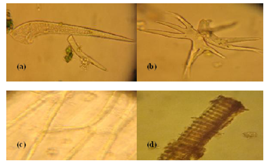 a) pelo urticante unicelular (400 x). b) pelo pluricelular (400x).c) parenquima (400x). d) vaso helicoidal (400x).