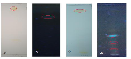Fase móvil: a) y b) tolueno/acetona (9:2); a) Rf=0,83 b) Rf=0,70 (365 nm).c) y d) Éter/acetona (9:1); a) Rf=0,80 d) Rf1=0,13; Rf2=0,22; Rf3=0,37 (365nm)
