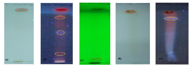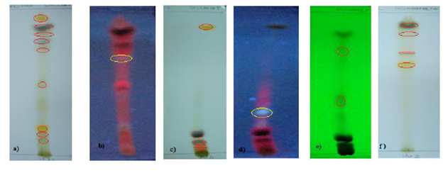 Fase móvil: a) y b) tolueno/acetona (8:2); a) Rf1=0,08; Rf2=0,12; Rf3=0,26; Rf4=0,55; Rf5=0,74; Rf6=0.79; Rf7=0,84; Rf8=0,87; Rf9=0,94; c) Rf=0,61 (365 nm). c), d) y e) Éter/acetona (9:1); c) Rf1=0,02; Rf2=0,05; Rf3=0,07; Rf4=0,08; Rf5=0,12; Rf6=0.8 d) Rf1=0,27 (365nm) e) Rf1=0,35; Rf2=0,74 (254 nm). f) tolueno/cloroformo/acetona (40:25:35) Rf1=0,55; Rf2=0,62; Rf3=0,74; Rf4=0,80