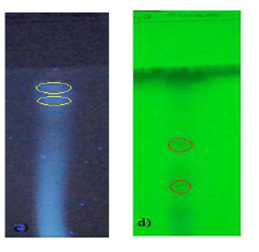 Fase móvil: c) y d) n-butanol/ácido acético/agua (50:10:40); c) Rf1=0,64; Rf2=0,69 (365 nm) d) Rf1=0,2; Rf2=0,30 (254 nm)