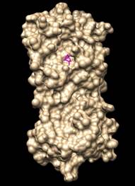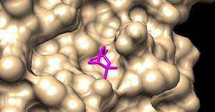 Imagen obtenida en el docking molecular con 6 servidores (PyRx, CMD, 1-Click docking, Amdock, Docking server, Webina) entre la Mpro del SARS-CoV-2 (en amarillo) y el eucaliptol (en magenta). Visualizador Chimera 1.16. Ctrl+Click para ver video