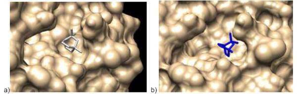 Imagen de acercamiento para visualizar el acoplamiento molecular entre Mpro del SARS CoV-2 (en amarillo) y: a) el eucaliptol (plomo) con el servidor Covid 19 server y en b) el eucaliptol (azul) con el servidor CBDock. Visualizador Chimera 1.16