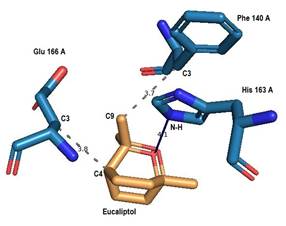 Los resultados de las simulaciones computacionales sugieren que el eucaliptol se une al sitio activo de la Mpro con una afinidad favorable, lo que podría tener implicaciones en el desarrollo de terapias antivirales. Existe una predominancia de fuerzas de interacción hidrofóbica intermolecular en el acoplamiento, ya que las características hidrofóbicas del sitio activo se deben a que la mayoría de los aminoácidos encontrados en este sitio activo son de carácter hidrofóbico