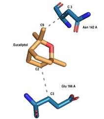 PLIP con CB dock y Covid server (figura 5), en cambio mostraron dos interacciones hidrofóbicas entre el eucaliptol y los aminoácidos Asn 142 y Glu 166 de la Mpro del SARC-CoV-2.