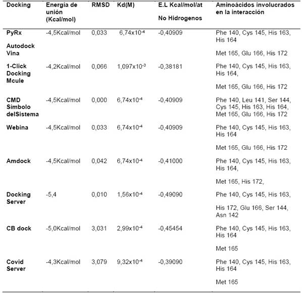 En el presente docking molecular, se obtuvieron las conformaciones del eucaliptol en el sitio activo de la proteasa del SARS-CoV-2, seis de las conformaciones obtenidas con seis servidores y/o software presentan una energía de unión con valores de -4,5 Kcal/mol (ver tabla1) valor de acoplamiento que bajo los criterios establecidos por Lee, M y Olson, (2006) afirman que mientras más bajo sea el valor, más alta será la afinidad entre el ligando y el receptor.