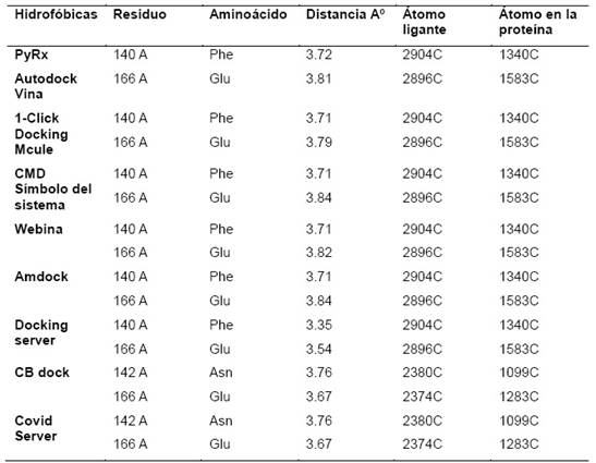 Las interacciones de carácter hidrofóbico detectados entre el eucaliptol y la proteasa viral se muestran en la tabla 2, en la que se aprecian los residuos de aminoácidos de la proteasa y las distancias entre el ligante eucaliptol y la proteasa viral que se presentaron con mayor frecuencia y en común con los ocho software y servidores en línea. Los aminoácidos en común con seis software y servidores en línea son la Phe y Glu excepto con CB dock y Covid Server donde se detectó la Asn en lugar de Phe. En un estudio sobre compuestos bioactivos realizado por Sharma, A. y Kaur, I. (2020) también detectaron al Glu y la Phe además de otros aminoácidos.