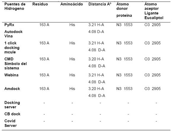 En la Tabla 3 se presentan las interacciones detectadas por puente de hidrogeno, se indican los átomos donor y aceptor, esta interacción se dio entre el átomo de hidrogeno del N3 de la His y el único oxigeno del eucaliptol, esto se presentó en cinco softwares y/o servidores en línea, los 3 restantes servidores no presentaron el mencionado puente de hidrogeno, en la búsqueda bibliográfica no se encontraron trabajos in silico que puedan corroborar la interacción por puente de hidrogeno.