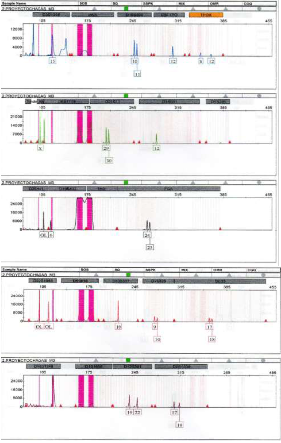 Amplificación de ADN: Considerando que el material genético fue extraído del contenido intestinal, era posible la presencia tanto de ADN del propio T. infestans como del parásito T. cruzi, además de otros posibles contaminantes genéticos provenientes de los restos de alimentos ingeridos o de otros microorganismos presentes en el intestino. Para la amplificación del ADN de interés, se empleó la técnica de PCR Multiplex utilizando el kit comercial GlobalFiler™ (Applied Biosystems). Este kit permitió la amplificación de 24 marcadores genéticos de origen humano, incluyendo 21 marcadores STRs (Short Tándem Repeats) en los loci: D3S1358, vWA, D16S539, CSF1PO, TPOX, D8S1179, D21S11, D18S51, D2S441, D19S433, TH01, FGA, D22S1045, D5S818, D13S317, D7S820, SE33, D10S1248, D1S1656, D12S391 y D2S1338, además de un marcador STR del cromosoma Y (DYS391), un marcador de inserción/deleción del cromosoma Y (Indel) y un marcador de sexo, la amelogenina.