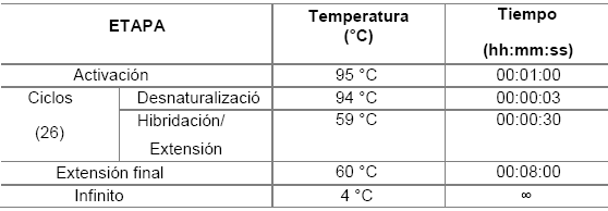 El protocolo de amplificación se llevó a cabo en un termociclador Veriti de la línea comercial Applied Biosystems. Este consistió en 26 ciclos de la siguiente manera: un ciclo inicial de activación a 95 °C durante un minuto, seguido de 25 ciclos con desnaturalización a 94 °C durante 3 segundos, alineamiento a 59 °C durante 30 segundos, y una extensión final a 60 °C durante 8 minutos. Finalmente, el producto amplificado se mantuvo a 4 °C hasta su posterior análisis. (Tabla 1).
