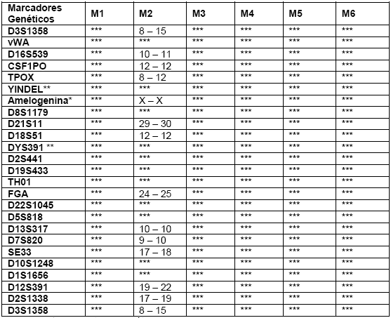 M = Muestra; ***Material genético analizable; """Marcadores "Y" STRs; *Amelogenina: marcador del sexo; X - X = Sexo femenino; X - Y = Sexo masculino