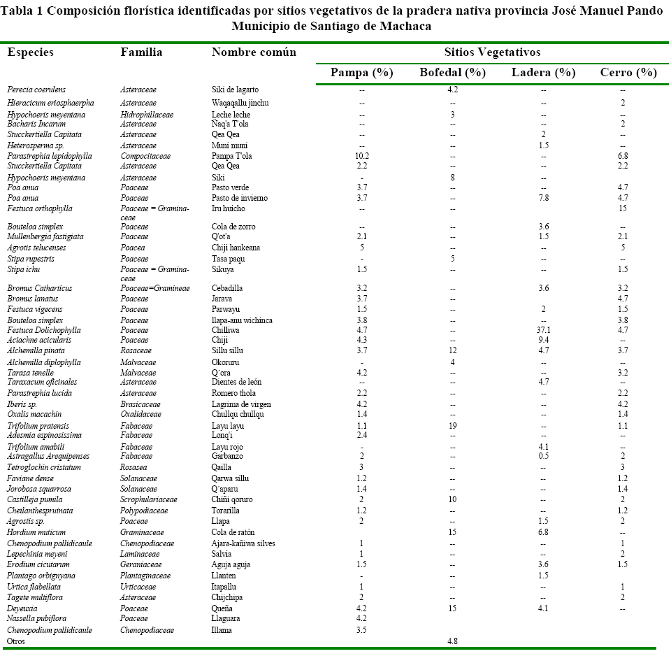 La vegetación fue diferente en los sitios evaluados, pampa, bofedal, ladera, y cerro, (tabla 1), los porcentajes de cobertura predominada en el sitio vegetativo pampa por Parastrephia lepidophylla, Agrotis telucenses y Festuca Dolichophylla, en el sitio vegetativo bofedal, Alchemilla piñata, Trifolium pratensis, Deyeuxia, en el sitio vegetativo ladera por: Aciachne acicularis, Festuca dolichophylla, Poa anua y en el sitio vegetativo cerro, Bacharis Incarum, Festuca orthophylla y Agrotis telucenses.