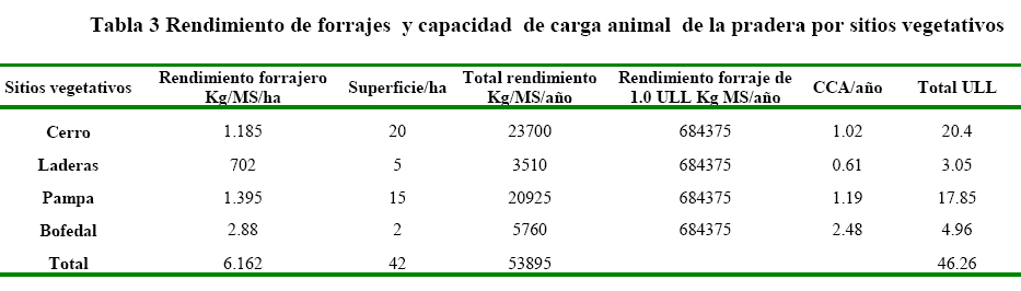 El rendimiento forrajero kg MS /ha según los sitios vegetativoes 6.162 kg MS /ha y la capacidad de carga animal (C.C.A) de los pastizales nativos es: Urtica flabellata es 1,02, Bromus ctarticus 0,61, Trifolium pratensis 1,19 y Hordium muticum 2,48 ULL /ha.