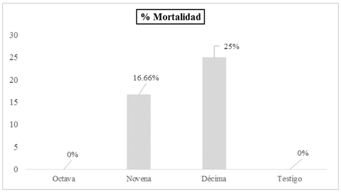 El rendimiento a la canal fue estadísticamente mayor en T1, T2 y T3, difiriendo de T0 (grupo sin castrar) qué manifestó el rendimiento más bajo, esto se debe al proceso lipogenésico que se produce en sus tejidos, el capón desarrolla más sus masas musculares, es decir hay una sustitución de grasa por proteína (tabla 4). La mayor mortalidad se registró en el grupo de pollos castrados a las 10 semanas (25.0%), seguido del grupo castrado a las 9 semanas (16.7%). No se registraron muertes en el grupo castrado a las 8 semanas ni en el grupo control, figura 1.