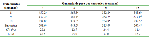 Con respecto a la ganancia de peso no existieron diferencias entre tratamientos en las primeras nueve semanas de la castración; sin embargo, en la semana 12 se observó una mayor ganancia de peso (p<0.05) en las aves castradas a las 8 semanas (343.6 g/ave) que en los otros grupos experimentales (tabla 1). Al aplicar la prueba de Tukey al 5% para la variable ganancia de peso total, en el cual se registran que no hay diferencias estadísticamente significativas entre la media de los tratamientos La castración a menor edad (8 semanas) existe mayor ganancia de peso.