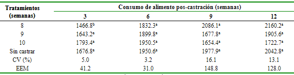 Los pollos castrados a las ocho semanas expusieron el menor consumo de alimento a las tres semanas de la castración en comparación con los otros grupos experimentales (p<0.05); sin embargo, no hubo diferencias entre grupos en las semanas siguientes (tabla 2). La conversión alimenticia mostró diferencias significativas entre tratamientos (p<0.05) a la semana 12 pos-castración hallándose el valor más alto en los pollos no castrados y castrados a las 10 semanas de edad (tabla 3).