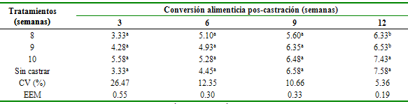 La conversión alimenticia se presentó a la semana 12 pos-caponización en los pollos castrados a las 8 y 9 semanas de (tabla 3) se debe a la mayor eficiencia del pollo para convertir el alimento en carne, producto de la castración, sin embargo, estos resultados no concuerdan con otros estudios, no se hallaron diferencias significativas sobre la conversión alimenticia6,12,22,26.