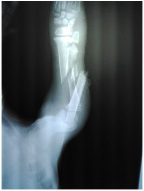 Con base a la anamnesis y examen físico, los diagnósticos sugeridos fueron: fractura completa de diáfisis de radio y cubito, fractura de la epífisis distal de radio, trauma de alta energía.
