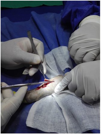 2. Tras el disecado la fascia del antebrazo se identifica los músculos extensor radial del carpo y extensor digital común, con la ayuda del retractor Weitlaner se realizó la retracción de los músculos lateralmente5.