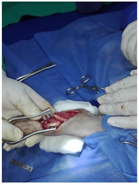 5. Se alineó y estabilizo la fractura para la aplicación de DCP, para ello se amoldo la placa de largo 40 mm grosor 0.2 mm y ancho 0.7 mm a la morfología del hueso, seguidamente se fijó la placa en la diáfisis del hueso fracturado con la ayuda de la pinza reductora verbrugge, y con el uso de taladro ortopédico puesta con la broca de 1.2 mm y la guía de 2.0 mm sobre la placa DCP en el hueso estabilizado, se realiza los agujeros para aplicar en ellas los tornillos corticales 2.00*10 mm.