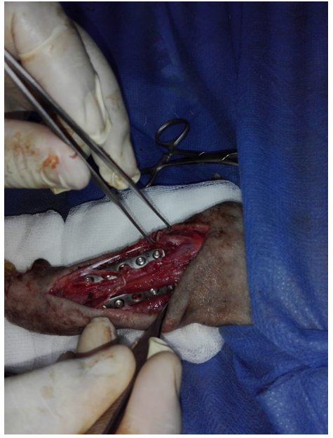 | Figura 5 Aplicación de placas de osteosíntesis DCP de largo 40mm altura 0.2mm y ancho 0.7mm y tornillos corticales convencionales de 2.00*10mm y 1 tornillo corticales de 2.00*12mm |