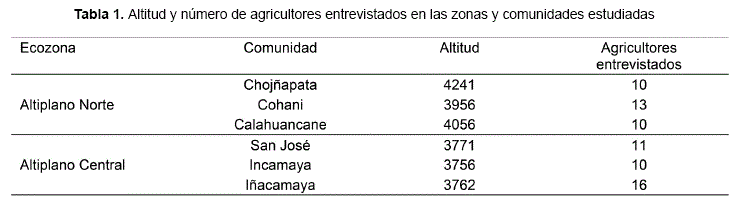 Para analizar en forma general las predicciones de los campesinos sobre el clima y las campañas agropecuarias en 2010-2011 y 2011-2012, se aplicó una encuesta de uso y manejo de indicadores a 37 productores del Altiplano Central y a 33 productores del Altiplano Norte de Bolivia seleccionados al azar en seis comunidades ubicadas en dos zonas agroecológicas distintas (Tabla 1).