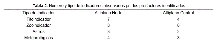 Los resultados obtenidos de las encuestas aplicadas en ambas ecozonas sobre el uso y conocimiento de indicadores locales climáticos revelan que aunque ambos ecosistemas se encuentran en el altiplano, en la parte Norte cercana al lago se muestra mayor diversidad y cantidad de indicadores manejados por los productores. La Tabla 2 presenta el número de indicadores vegetales, animales, de astros y meteorológicos que son observados en ambas zonas.