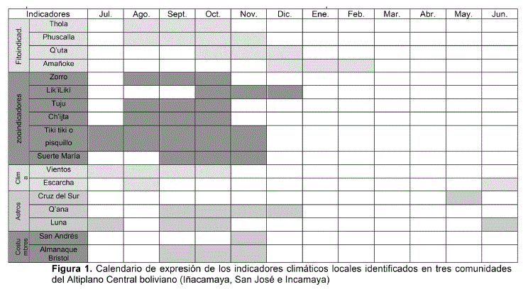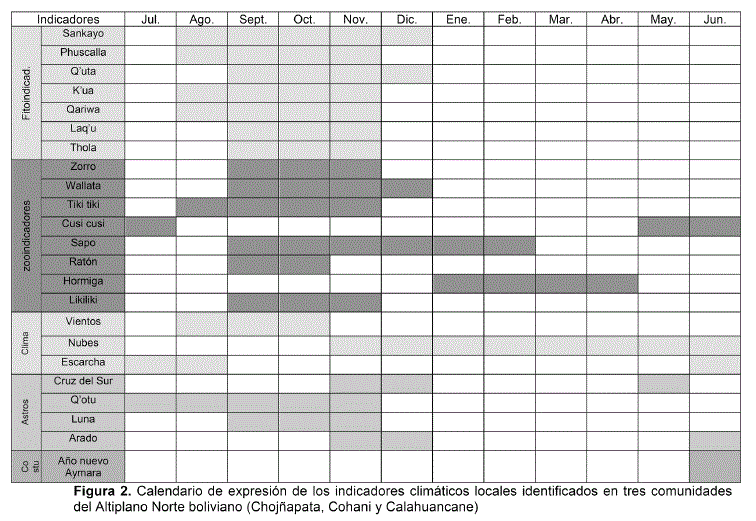 Los meses de expresión de los indicadores muestran indicios acerca de las razones que desencadenan su expresión. Las temperaturas extremas del invierno altiplánico y la muy baja humedad atmosférica, impiden o reducen la expresión de cualquier indicador biológico en los meses de Mayo, Junio y Julio, pero a su vez los cielos poco nubosos favorecen la observación de los astros. En Agosto y Septiembre, las temperaturas mínimas más benignas y la llegada de humedad atmosférica gracias a la circulación global, estimulan la expresión de los indicadores silvestres que, a diferencia de los cultivados, no dependen de las acciones del hombre, por tanto responden a su medio ecológico. La poca expresión, mencionada por los productores desde Diciembre a Abril, no necesariamente se refiere a que los indicadores no se expresan, sino a que no se encuentran dentro del calendario de observación de los productores, por estar ello dedicados a otras actividades.