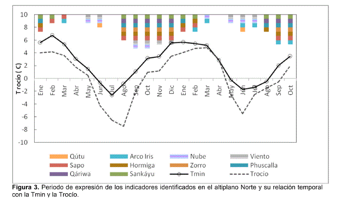 Aunque las metodologías para llevar adelante los estudios fueron similares en ambas zonas, la recolección y el seguimiento de los productores clave identificados, no produjo la misma calidad de información, pues en el Altiplano Norte se pudo apreciar la expresión de los indicadores con mayor claridad que en el Altiplano Central. La Figura 3 muestra un resumen de los periodos de expresión de los indicadores identificados en el Altiplano Norte. Similarmente en el Altiplano Central, se pudo identificar que los indicadores presentan su mayor expresión entre los meses de Junio a Diciembre para luego disminuir y casi no expresarse hasta el próximo Junio.